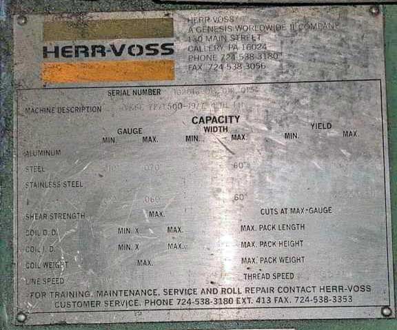 -Rated: Hot & Cold Galv. Steel -Width: 60" -Maximum Weight: 50,000 lbs. -Input Coils: Inside Diameter: 15" to 39" Outside Diameter: 72" Maximum -Material Thickness: 0.011" - 0.135" -Line Speed: 570 FPM (Gear, Low) 970 FPM (Gear, High) 1600 FPM Max. -Line Direction: Right to Left